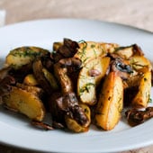 New potatoes fried with оyster, mushrooms, onions and fragrant garlic. Served on a hot frying pan with aromatic herbs